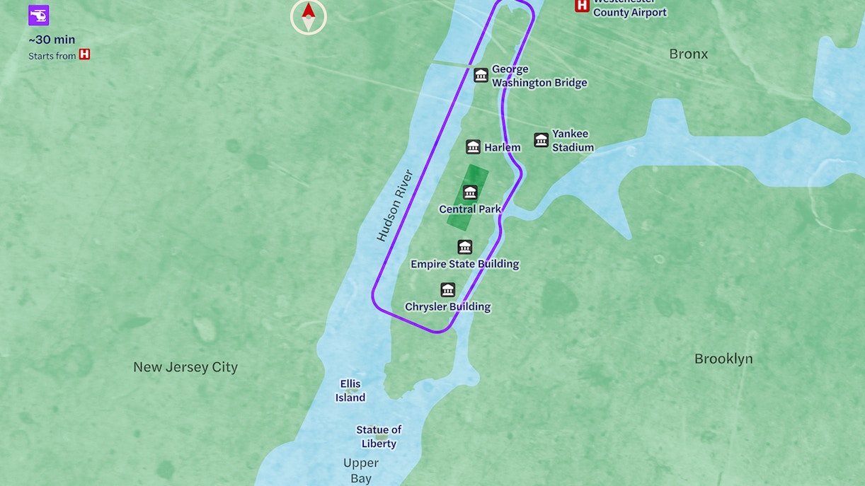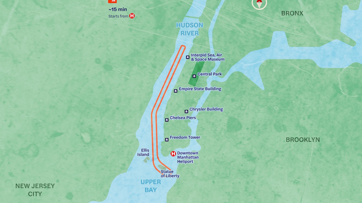 Ruta: Los primeros lugares visitados son la Isla del Gobernador, la Isla Ellis y la Estatua de la Libertad. A continuación, navegarás por Manhattan, divisando Central Park, el Chrysler Building, el Empire State Building y Times Square. Admira el U.S.S. Intrepid Sea, Air, & Space Museum, Chelsea Piers, West Village y Tribeca. Presenta tus respetos en la Zona Cero y en el Memorial del 11-S y regresa al helipuerto tras una experiencia neoyorquina sin igual.