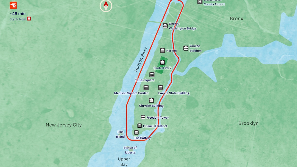 Lo que verás Estatua de la Libertad, Ellis Island, One World Trade Center, Memorial del 11-S, Puente de Brooklyn, Battery Park, Wall Street/Distrito Financiero, Empire State Building, Chrysler Building, Madison Square Garden, Times Square, U.S.S. Intrepid Sea, Air, and Space Museum y Central Park.