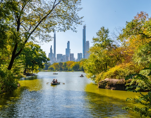 Alquila un bote de remos en Loeb Boathouse y rema por el lago de Central Park para disfrutar de una vista única de la ciudad.