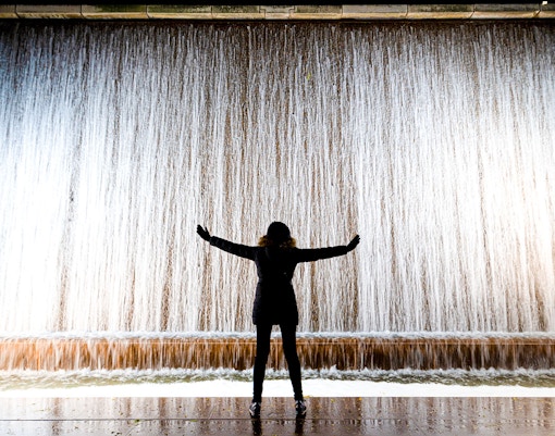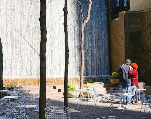 Another hidden gem, this small park features a waterfall, lush plantings, and café tables.
