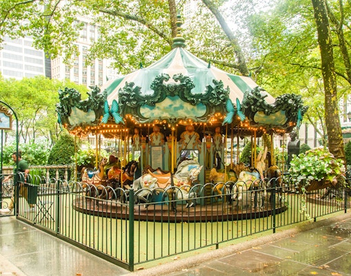 A whimsical carousel with French-inspired animals, set in the heart of Bryant Park.