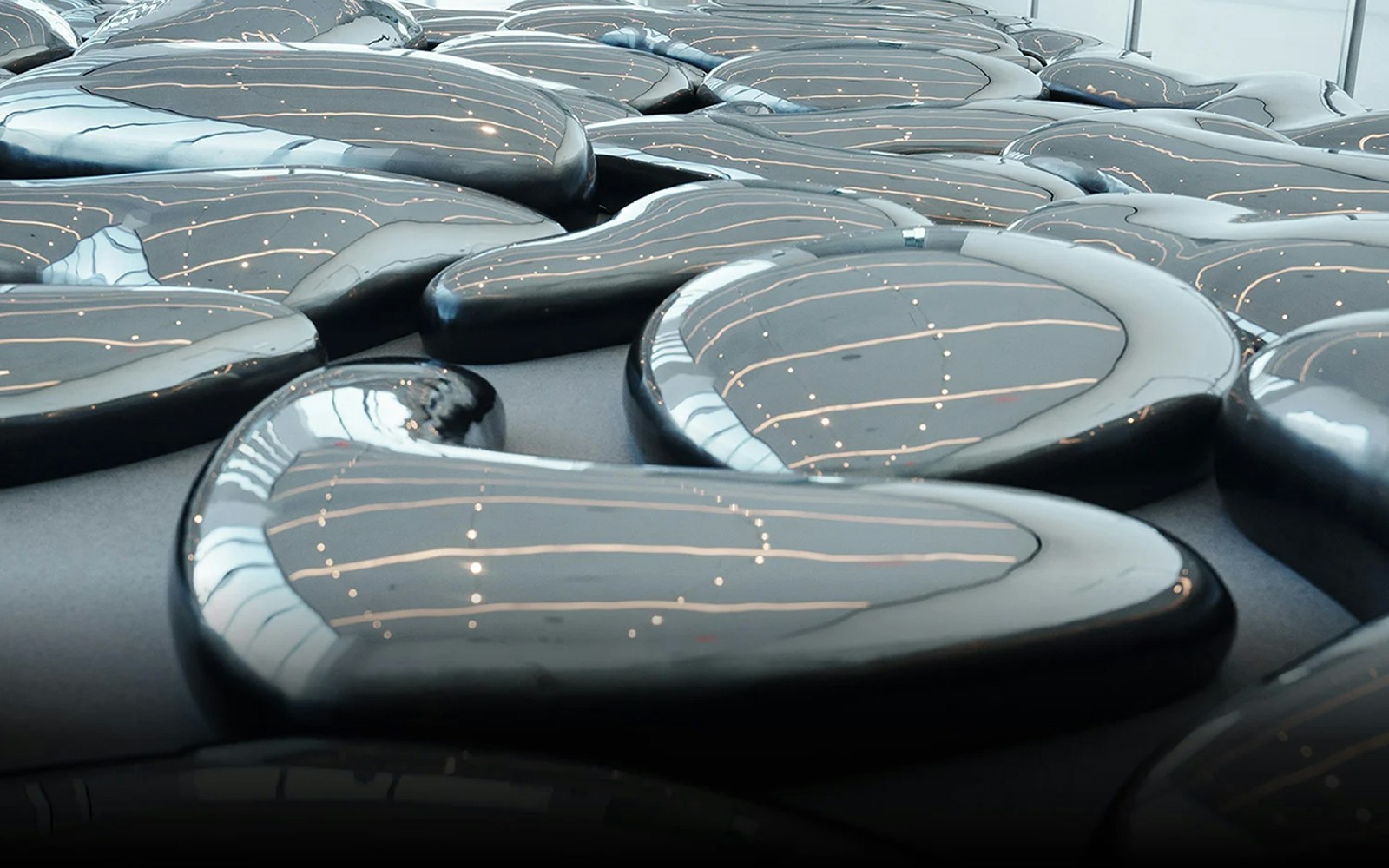Surrounding windows and ambient lighting create endless reflections that blur the line between sculpture, space, and sky.